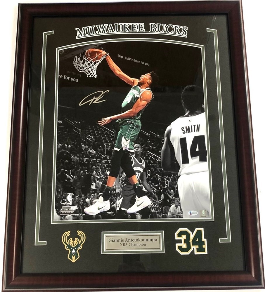 Giannis Antetokounmpo –16X20” photo autographed, framed with laser cut double matted and engraved plate That reads “NBA CHAMPION” The winning bidder will pay shipping cost based on zip code if unable to pick up at the event or PVA Chapter office in Milwaukee, WI.