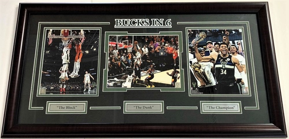 Giannis Antetokounmpo “Bucks in 6” – 3 – 8x10 photos from 2021 Finals “The Block” – “The Dunk” – “The Champion” Double matted with engraved nameplates The winning bidder will pay shipping cost based on zip code if unable to pick up at the event or PVA Chapter office in Milwaukee, WI.